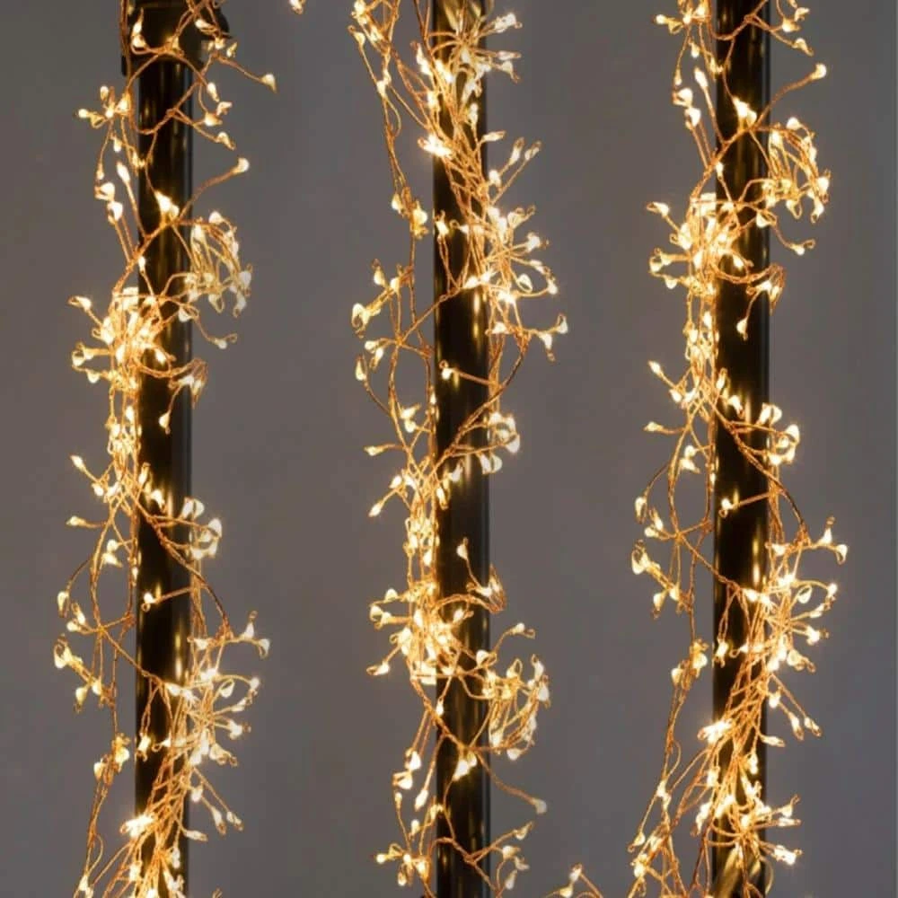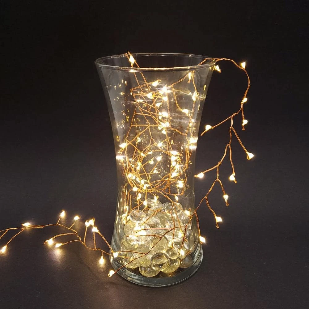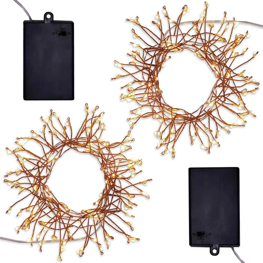Battery operated firecracker fairy string lights will bring a spectacular ambience to a special event or your everyday home decor. This set of two strands of bendable wire with one hundred 1.5″ off-shoots, each with a mini LED light attached to the end, creates a firecracker design. The glowing micro LED lights look like a glimmering droplet of water clinging to the end of a shiny wire. These weatherproof lights are perfect for illuminating floral arrangements, table settings, mantles, centerpieces, and so much more. Each firecracker light requires 3 AA batteries (not included). Battery operated firecracker lights are also known as cluster lights, fairy garland lights, or snake lights.