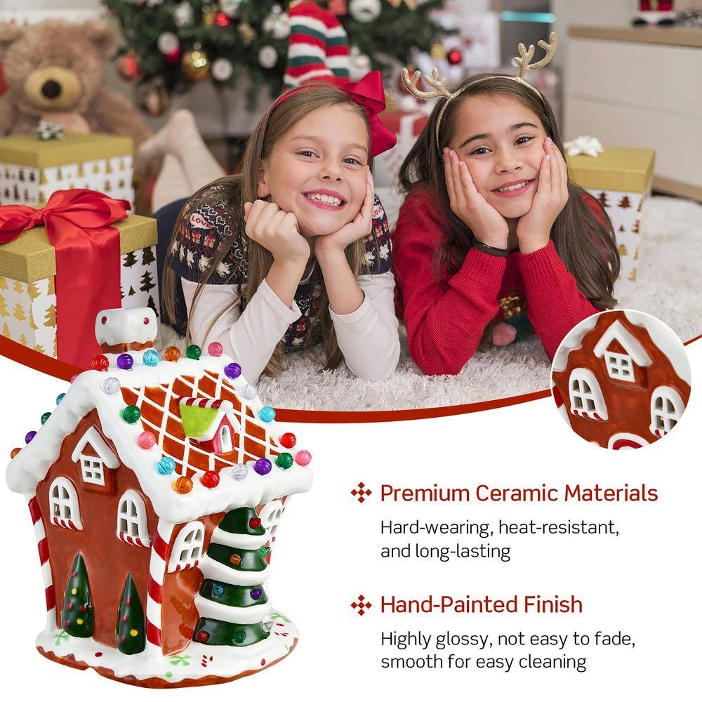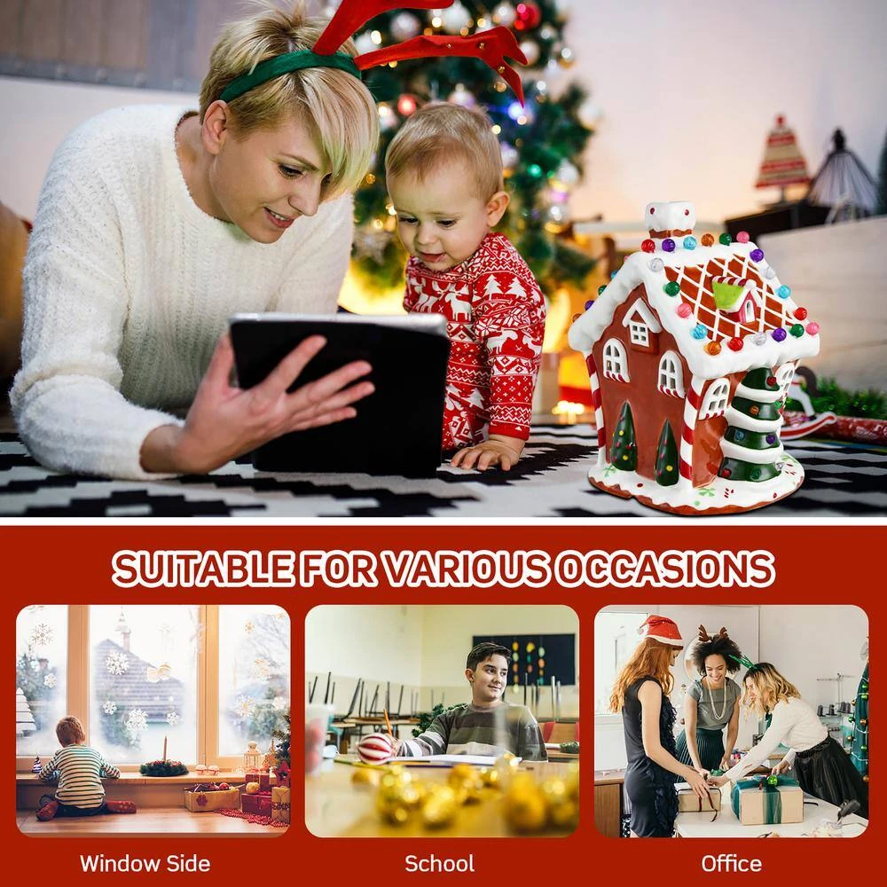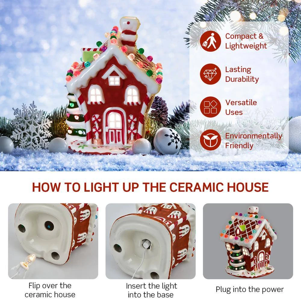 This is our 10 ft. ceramic tabletop Christmas house which combines stunning color matching and exquisite hand-painted craftsmanship to bring festival atmosphere and fun. Crafted of durable ceramic material, the pre-lit ceramic house is fireproof and wear resistant, offering you long-term quality service. Equipped with LED lights and decorated with 44 colorful decorative beads, there is no doubt that it will be the most eye-catching scene in the room. Easy installation required, just insert the small bulb into the base and turn on the switch to make the tabletop Christmas house light up your room.
