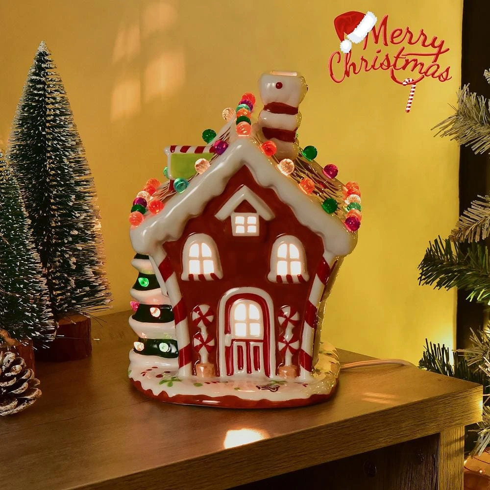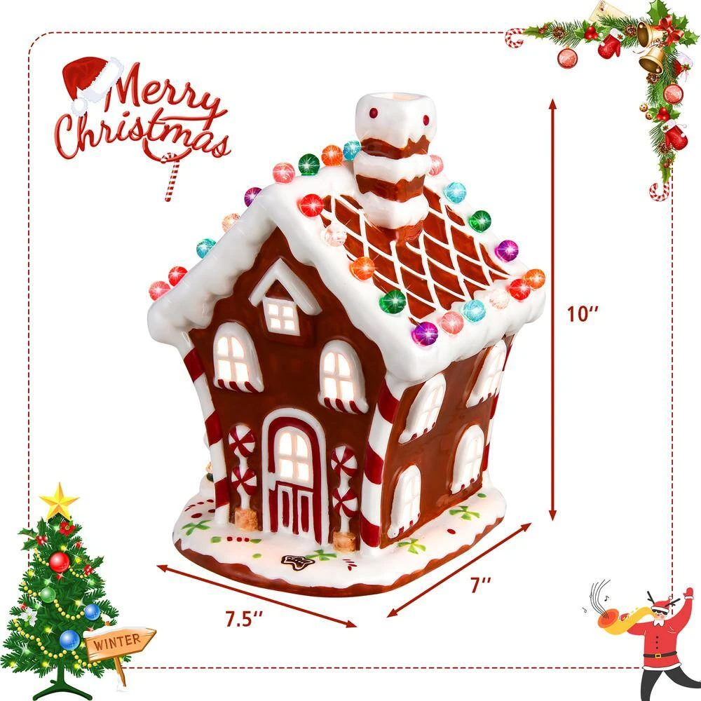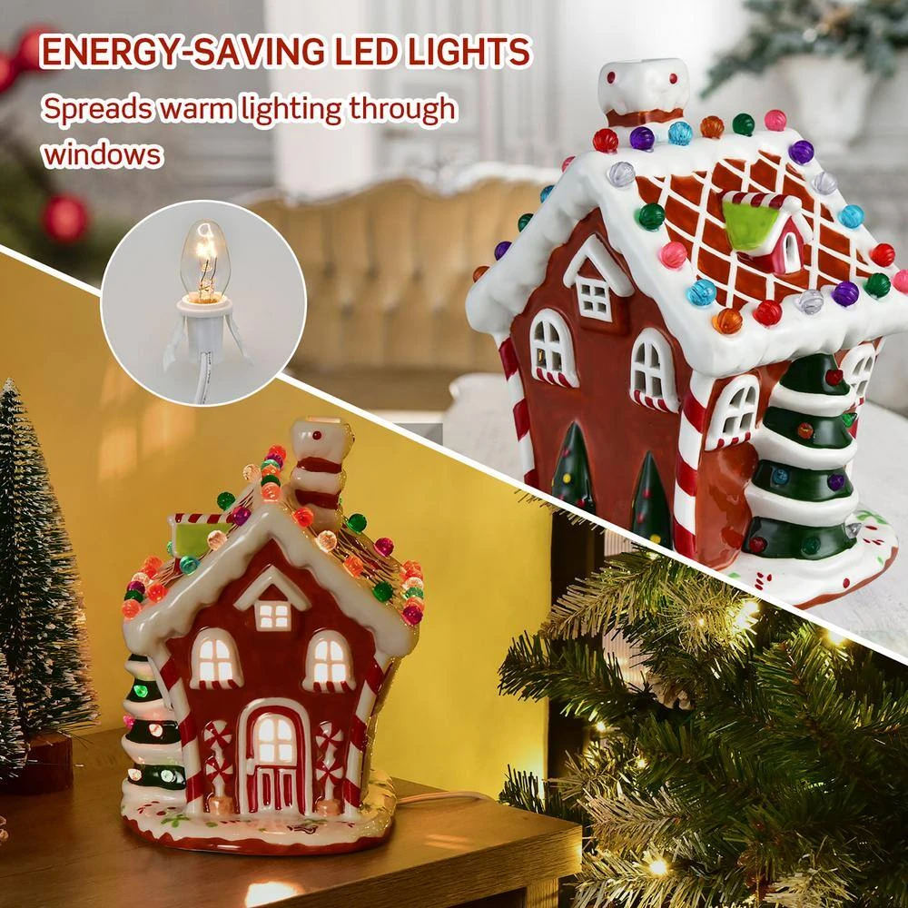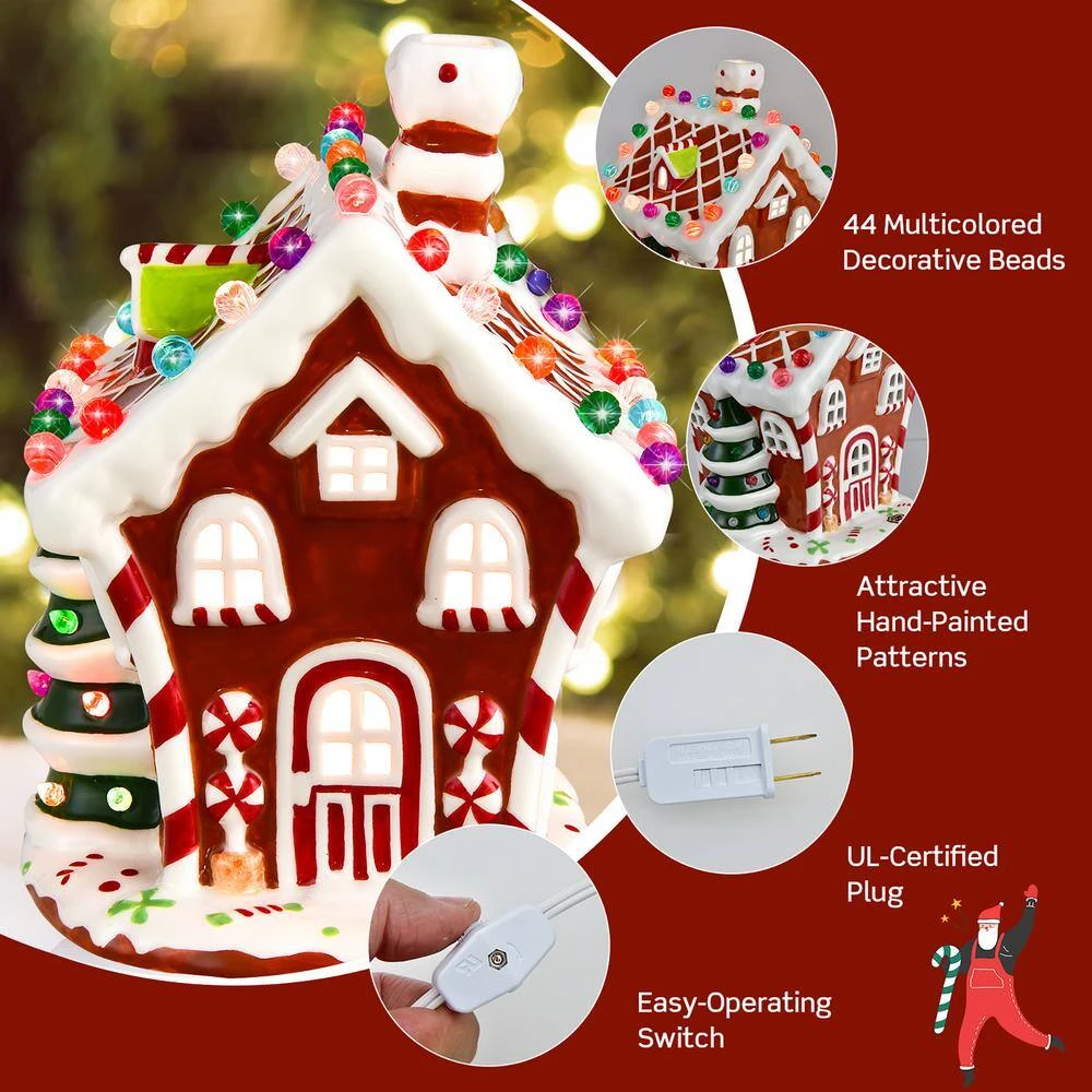 This is our 10 ft. ceramic tabletop Christmas house which combines stunning color matching and exquisite hand-painted craftsmanship to bring festival atmosphere and fun. Crafted of durable ceramic material, the pre-lit ceramic house is fireproof and wear resistant, offering you long-term quality service. Equipped with LED lights and decorated with 44 colorful decorative beads, there is no doubt that it will be the most eye-catching scene in the room. Easy installation required, just insert the small bulb into the base and turn on the switch to make the tabletop Christmas house light up your room.