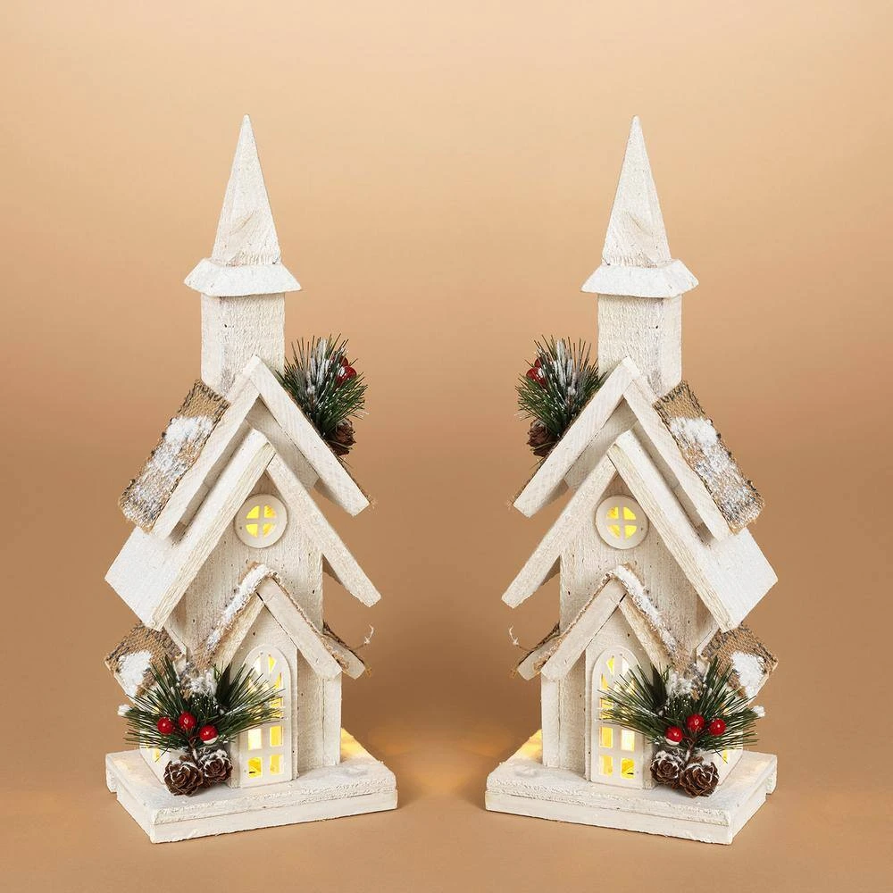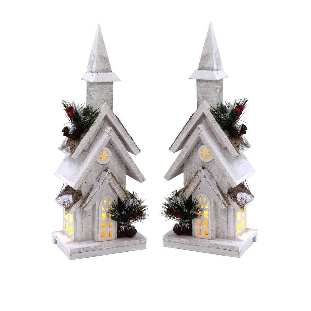 This set of two 15.2 in. H snow kissed churches with a multi tier gabled roof and steeple is a beautiful reminder of the season. Accented with pine cones, red berries and pine needles, the battery operated lights glow gently from the paned doors and windows. Includes convenient 6-hour timer.