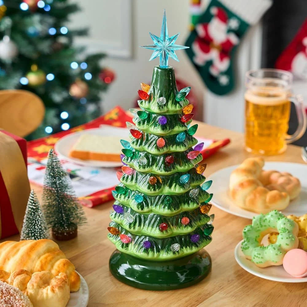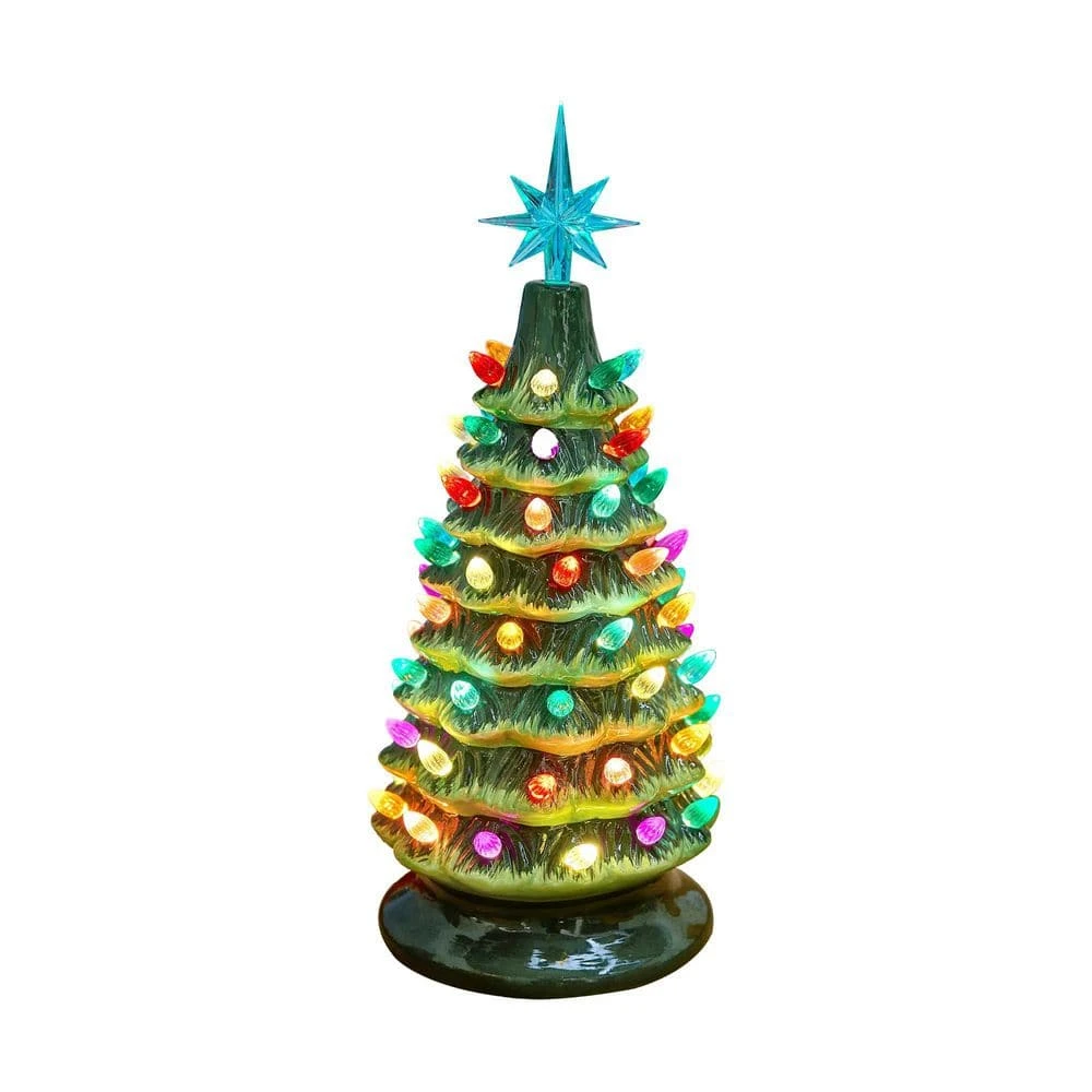 - 15 in. ceramic tree with vibrant bulbs and star topper for festive charm
