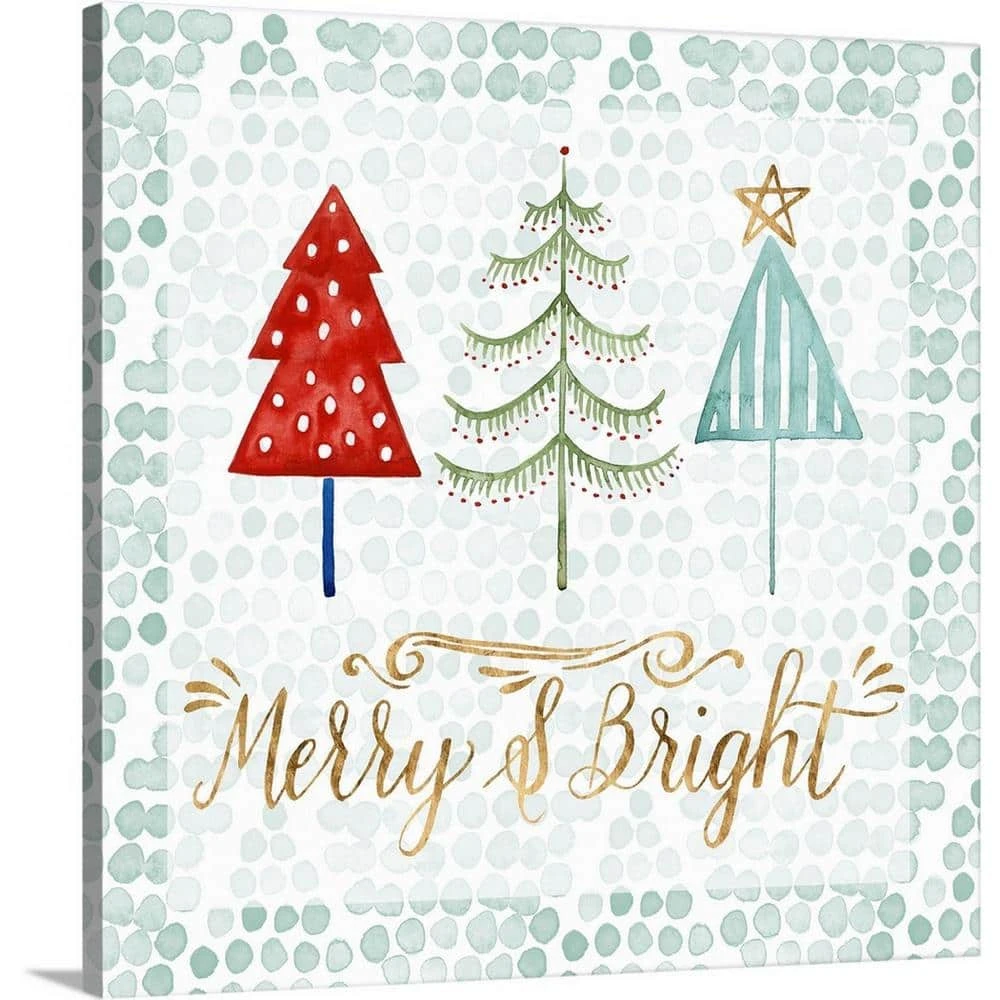 Solid-Faced Canvas Print entitled Christmas Tree Whimsy III . A trio of three colorful patterned Christmas trees with gold script. Our proprietary canvas provides a classic and distinctive texture. It is acid free and specially developed for our giclee print platforms. Each print is produced with our own archival UV quality inks supporting a vibrant color gamut, while being scratch and fade resistant. Each premium canvas gallery wrap is finished with a closed back preventing dust collection inside the back of the wrap. The back includes a pre-installed, ready-to-hang sawtooth hardware.