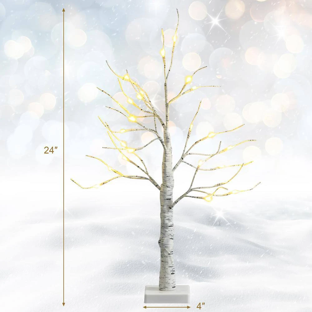 This is our elegant holiday white birch tree. The tree is equipped with 24 LED lights, providing warm white lights for your room during the night. A room with decoration trees can always bring a festive atmosphere to your home. The branches of the tree are flexible enough to be bent into any shape as you wish. We adopt 100% new PVC as raw material to build this tree. This recyclable material is odorless, non-toxic, durable, as well as lightweight to move around easily. The tree is powered by 3 AA batteries (not included). Don’t miss our elegant twig birch tree and take it home to decorate your home.