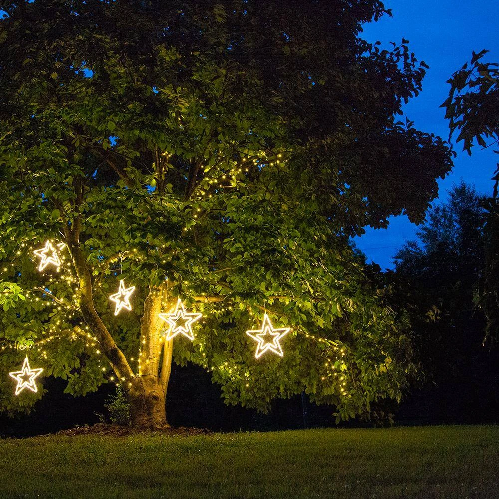This unique double star will give your holiday lights a festive, colorful touch this season, or any time of year. The long-lasting, energy efficient LED mini lights are encased in UV resistant PVC tubing and strapped to a sturdy metal frame, so this star will shine brightly through even the darkest nights. And its long 5 ft. lead cord is ideal for hanging display. Perfect for hanging from trees, fences or other exterior surfaces. Use it for birthday parties, team events and more.