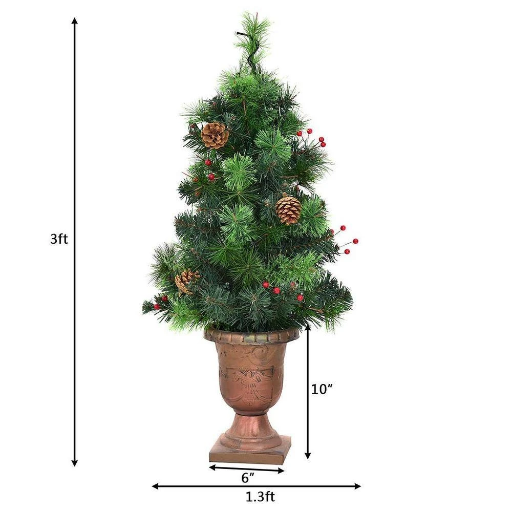 Elevate your holiday decor with this realistic artificial Christmas tree. Adorned with red berries and pine cones, it effortlessly matches any theme. Pre-lit with warm white LED lights for easy setup. Crafted for lasting charm, it’s a cherished addition year after year. This potted small Christmas tree is an ideal for doorways, hallways, porches.