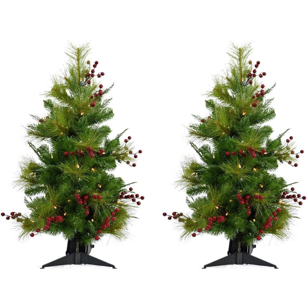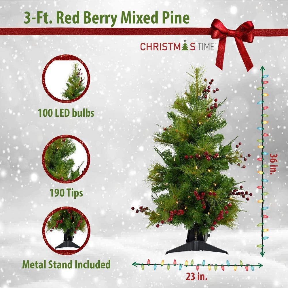 The 3 ft. Red Berry Mixed Pine Artificial Tree Set from Christmas Time eliminates the need to ever shop, chop and pay for another natural tree again. Christmas Time produces the most realistic trees in the market. Painted to create a beautiful frosted effect, this Red Berry Mixed Pine Set features lifelike foliage and all-metal hinged branch construction. Simply unfold them out of storage and they’re ready to add holiday cheer to your home. These models are pre-strung with warm white LED lighting, each featuring a system of 100 long-lasting bulbs. Each tree’s needles are constructed out of non-allergenic, flame-retardant materials to keep your family safe this holiday season. These details create the look of natural trees without all the mess and maintenance. Designed to last, this Red Berry Mixed Pine Tree Set is sure to add convenience and ease to your holiday season, year after year.