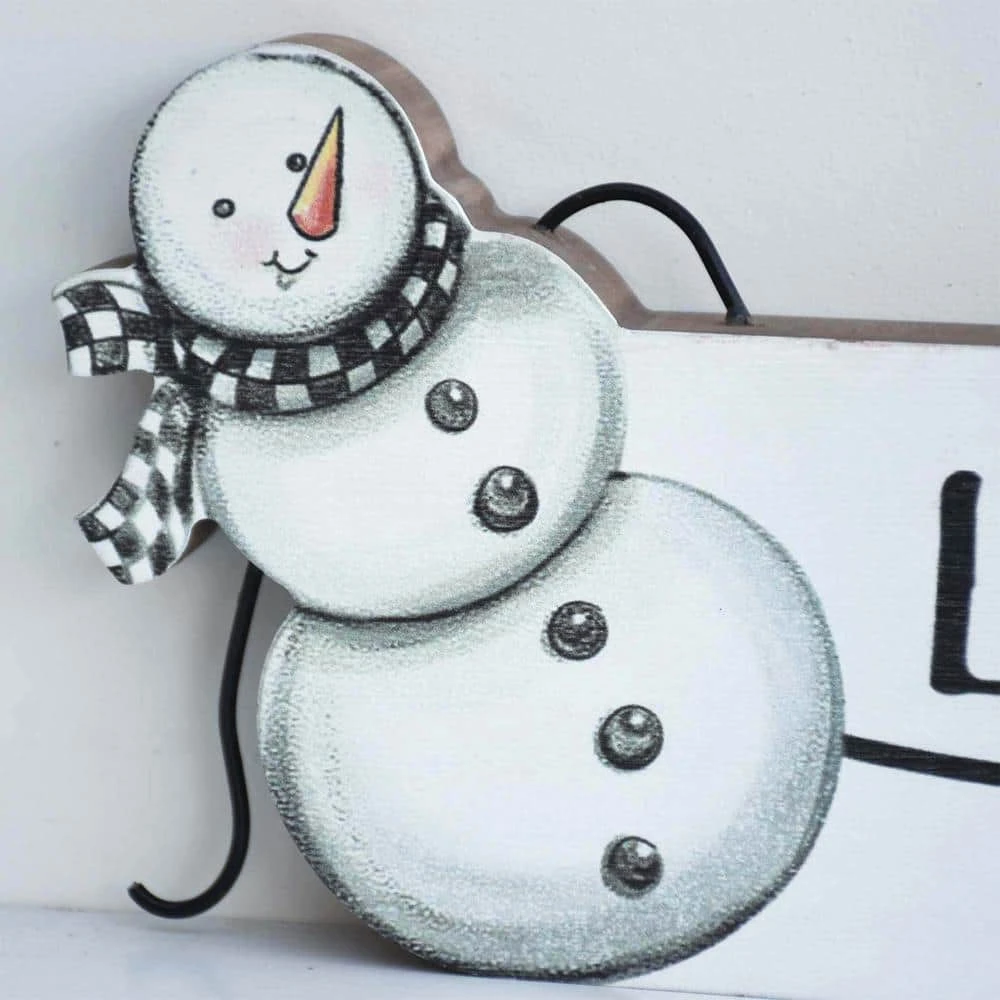 - Cute design – this whitewashed wood sign features a cheerful snowman on the left and black, calligraphic text that says