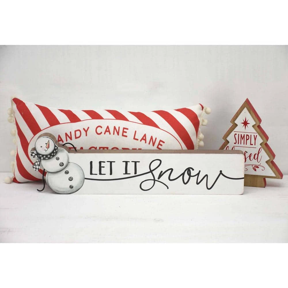Make your home cozy and cheerful with this wood and metal sign that is a great size to accent a shelf, mantel or table decor. It measures 15.5 in. W x 4.375 in. H. The white wooden sign is accented with a cheerful snowman and painted to perfection and says
