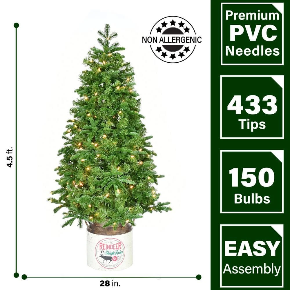 Spruce up your holiday decor with this 4.5-ft. porch tree from Fraser Hill Farm. Featuring lifelike foliage and all-metal structure for strength and durability, this classic tree is specially crafted using the finest materials to look realistic and provide you with many seasons of use and enjoyment. The branches are constructed from non-allergenic and flame-retardant materials then painted multiple hues of green so no two are exactly alike. A reindeer themed pot and 150 warm white LED lights accent the branches to create the look of a festive tree that requires hardly any maintenance. Place one in a corner for a lovely pop of green or buy two to frame a door, entryway, or fireplace. Simply turn on and display – no clipping or watering required!
