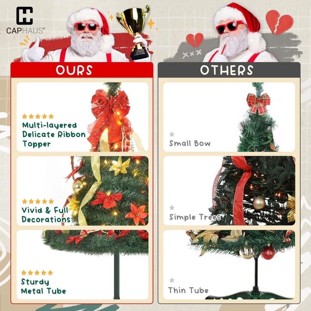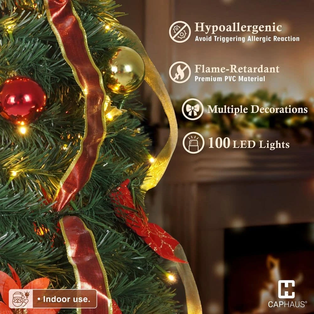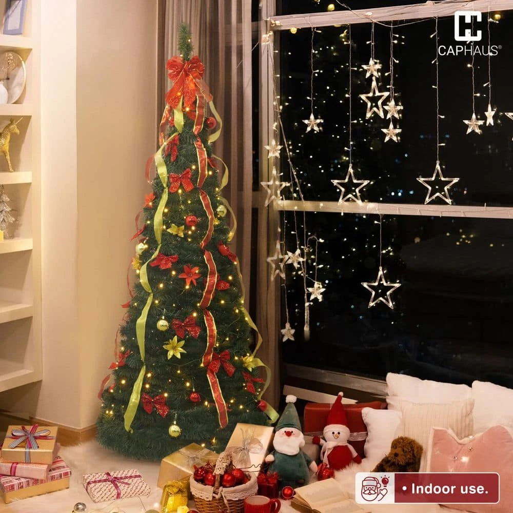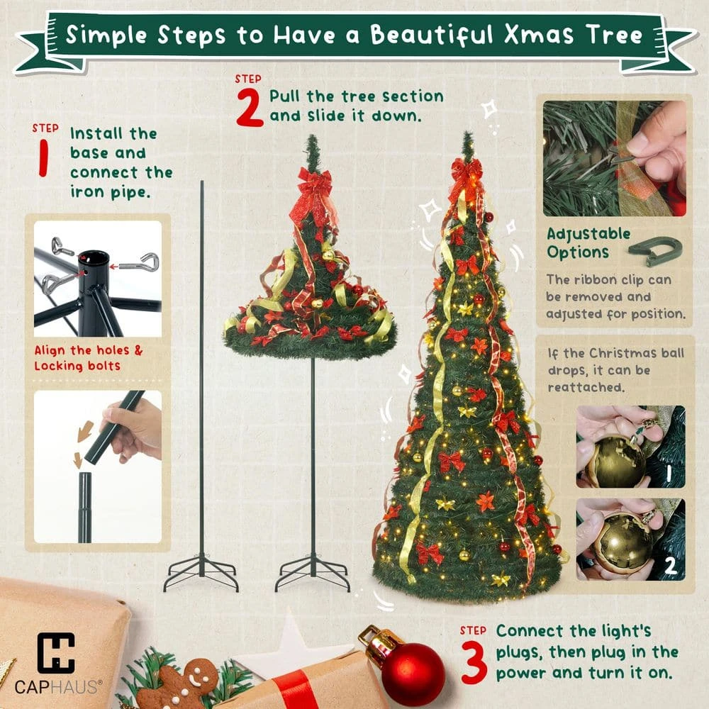 CAPHAUS 4.5 ft. Artificial Pop Up Christmas Tree w/ 2 Red and Golden Ribbon, 100 LED Lights, Pre-Hinged. Foldable, with Green Plastic Stand, for Indoor, Office, Party, Holiday Decoration. Radiant Illumination: Brighten your celebrations with our 4.5 ft. Christmas tree, featuring 100 built-in LED lights, these energy-efficient lights create a warm and inviting glow, making your tree the centerpiece of holiday cheer, for indoor use only.