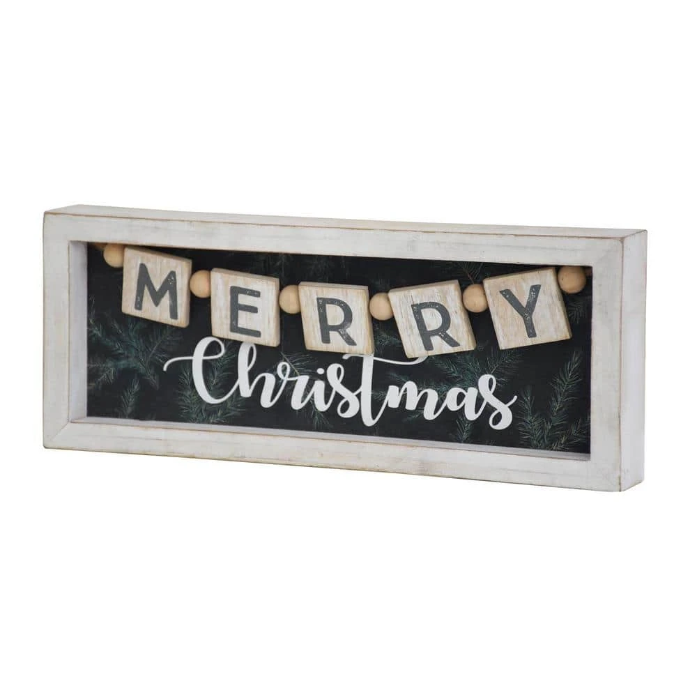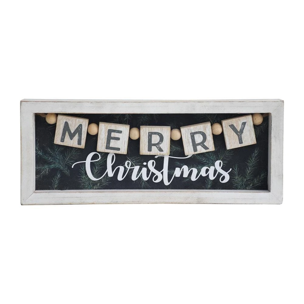 Bring holiday cheer into your home with this framed farmhouse style Merry Christmas Wood Tabletop Sign. This freestanding wood decor features a rustic white frame with a black background which is accented with a wood and bead strand that reads MERRY while Christmas pops in a white font, making your home merry and bright in the Christmas season, the rectangular wood piece measures 11.75 in. W x 4.75 in. H, can be used as a centerpiece or accent piece on a dining room table, coffee table, end table, or as a welcoming sign near the front door. Give as a Christmas gift to friends or family members, also makes a thoughtful and impressive housewarming gift.