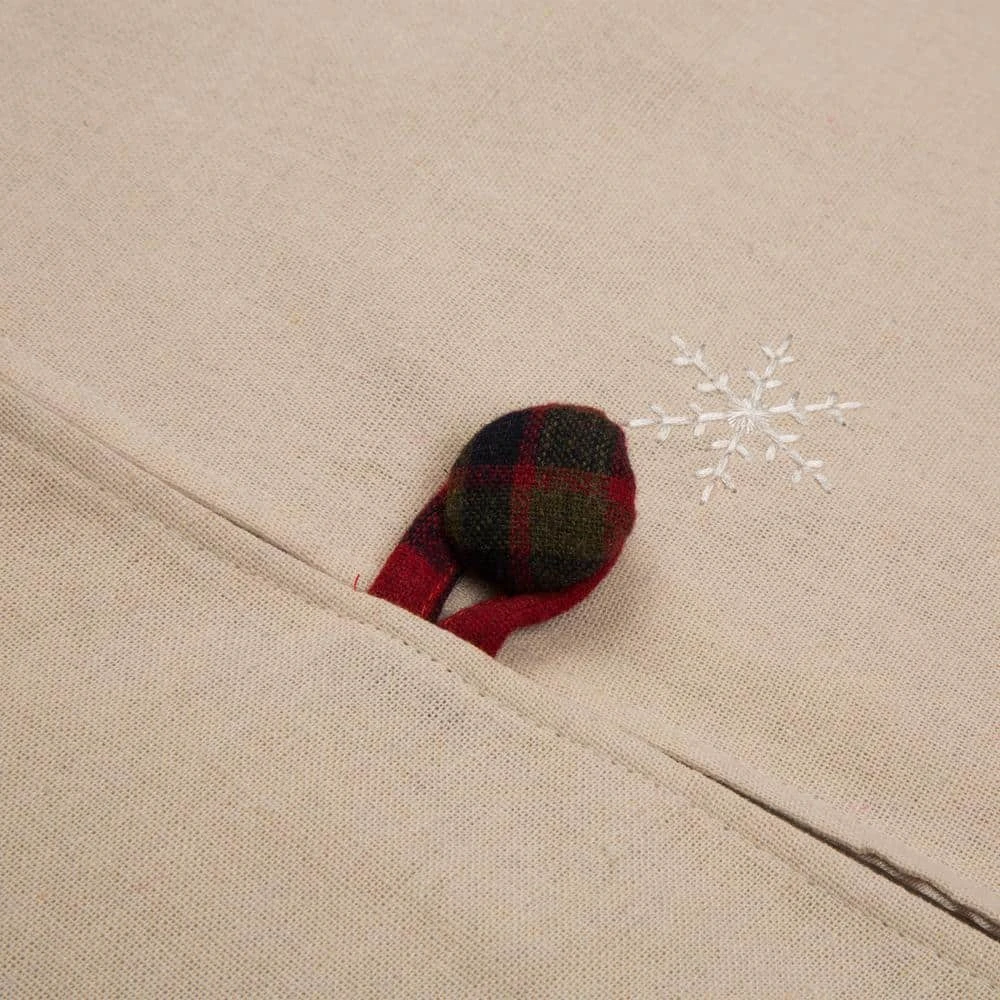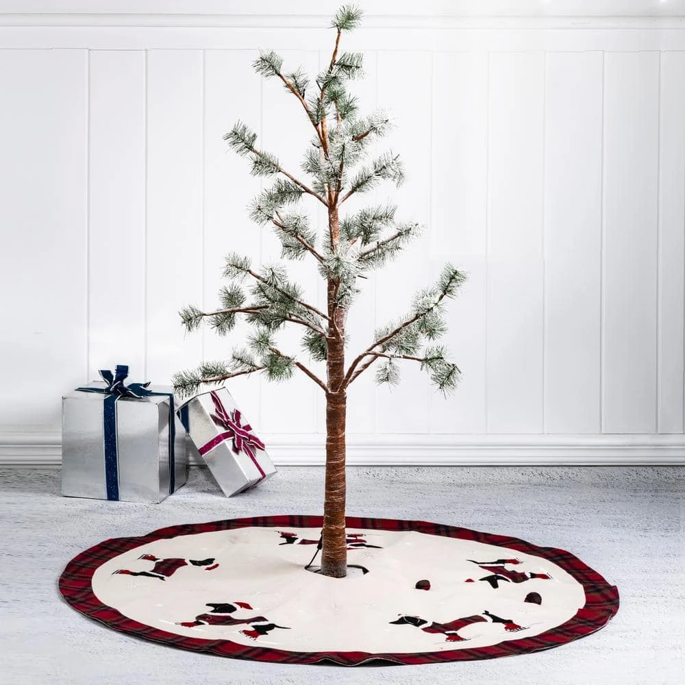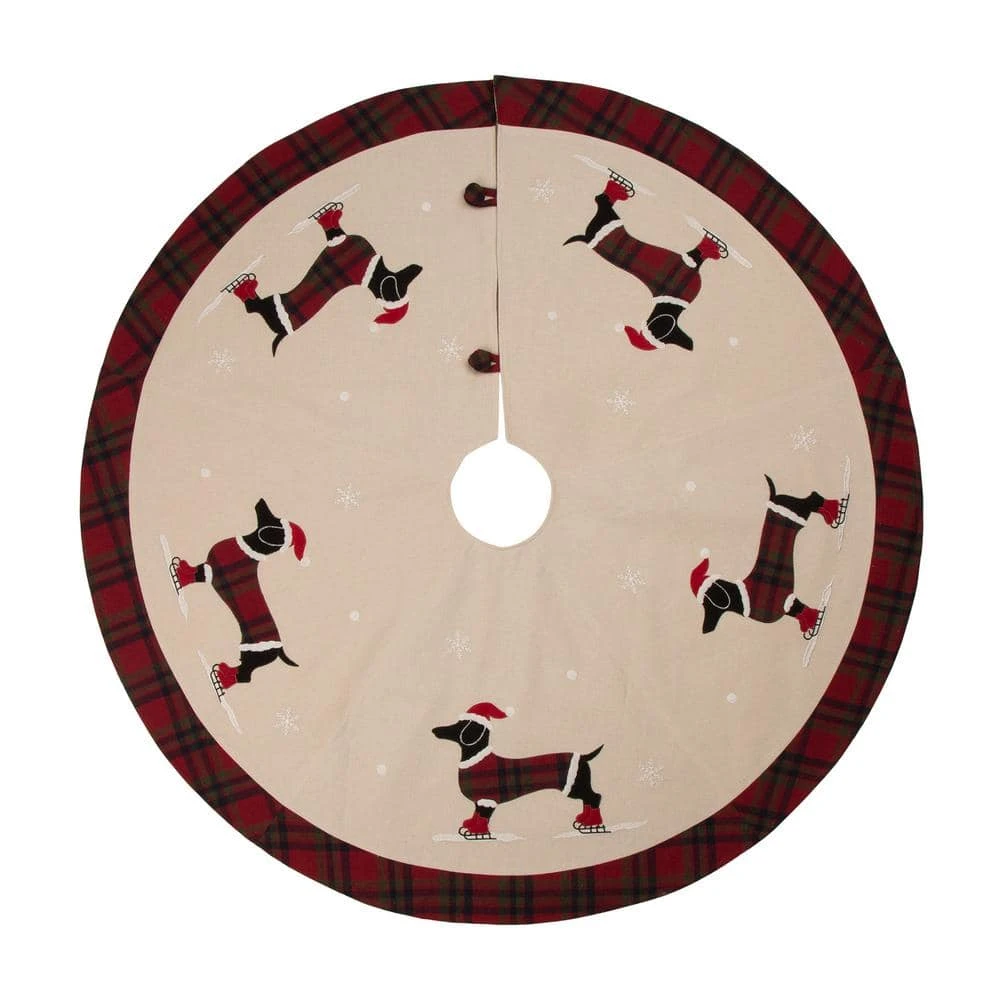 Tree skirt features embroidered with 5 lovely Christmas dog design sure to enhance your Christmas tree. Brighten your family gatherings with the delicate look of red plaid edge which adds an extra-decorative touch beneath the tree. Close with 3 summarys.