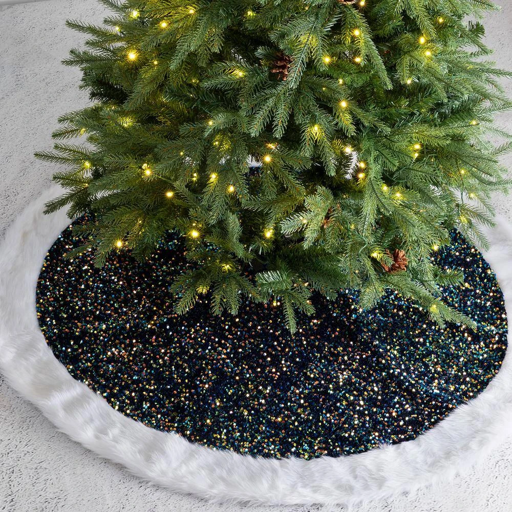 The 48 in. D blue sequin tree skirt decorated with white faux fur cuff. Blue velvet ropes attached for your easy knotted. Dress up your Christmas tree with this gorgeous sequin tree skirt.
