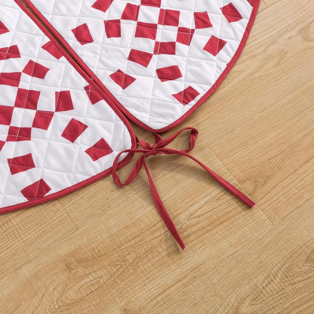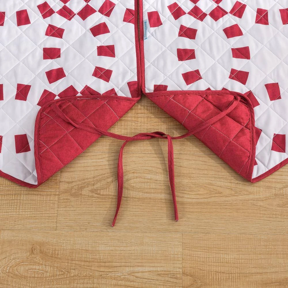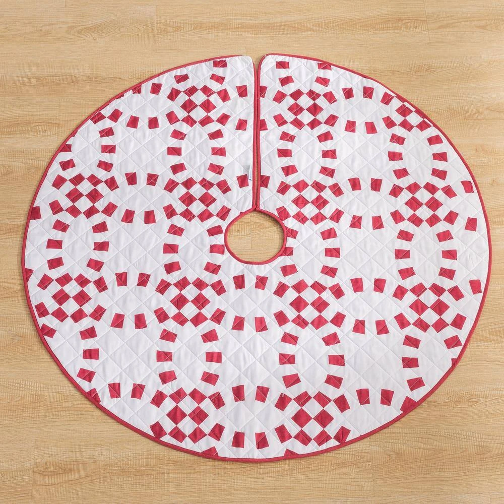 This bright and bold COUNTRY LIVING Holiday Ring design will bring the holiday season to any room. Double ring print features a candy cane striping pattern. Both sides feature a soft brushed microfiber fabric with diamond quilt stitching and are finished with a matching binding for a clean look. The fully reversible tree skirt features a coordinating solid color backing to provide versatility in your styling. Can coordinate back to the Holiday Ring Quilt Set and Stocking (sold separately).