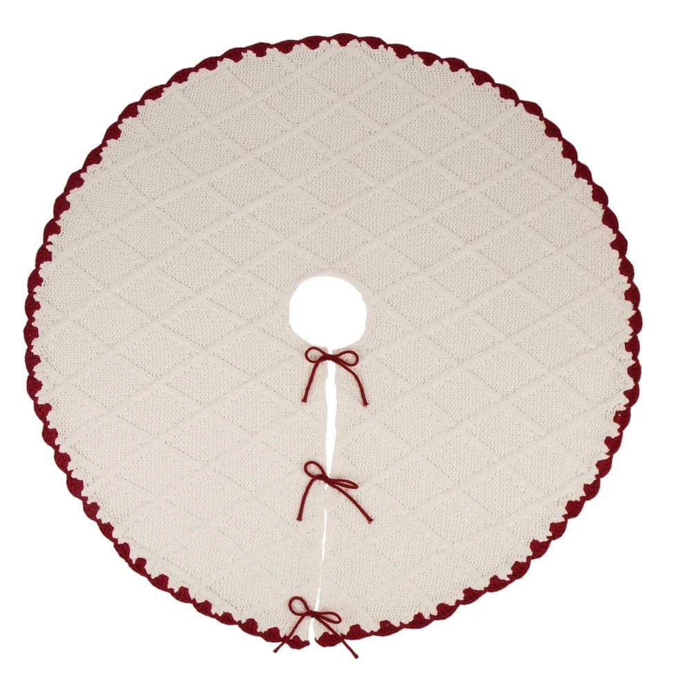 This warm and stylish holiday knitted makes it easy to catch needles and protect fallen ornaments with red trim. Complete the look of your tree with this adorable chenille tree skirt. Great for Christmas cabins or festive farmhouses.