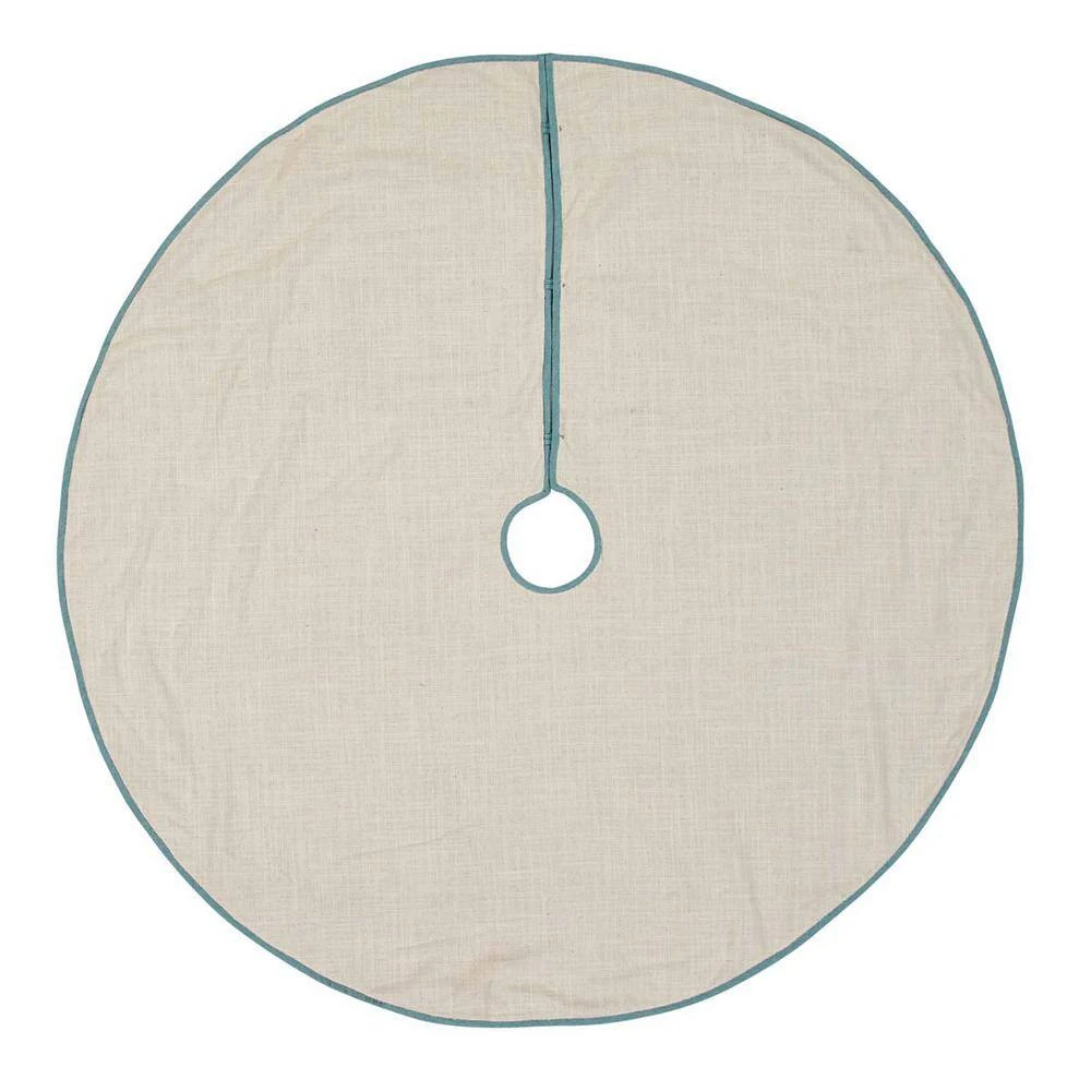 Invite the illusion of relaxing waves under the tree this year with the Sanbourne Tree Skirt. The shiny rope trim is adorned as a wave-inspired pattern over a textured creme and black jacquard cotton. The opening and outside edge is trimmed with 0.5 in. turquoise chambray and features 3 coconut summary closures and reverses to solid creme cotton slob.
