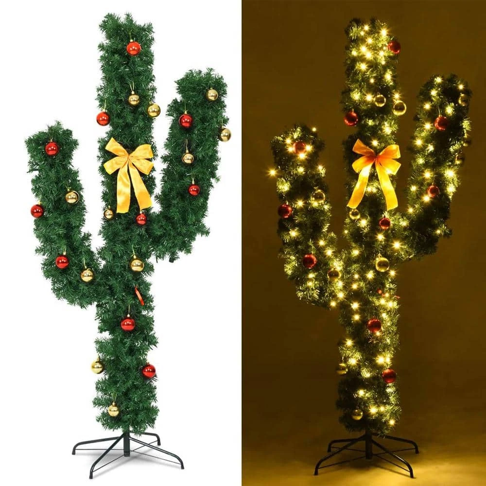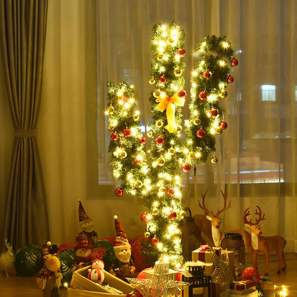 This artificial cactus Christmas tree with prelit LED lights will add a warm, festival feeling to any setting. This beautifully unique cactus tree come prelit with warm white LED lights, it is made of traditional PVC tips, Yellow Bow, Ball Ornaments and a Metal Tree Stand is Included. Made of dense PVC needles providing it with a fresh cut look that will last all season. The pre-installed warm white LED lights suit your holiday spirit, add a fantastic festive atmosphere to your home. Glowing warmly from the centerpiece tree’s branches can provide the perfect brightness, creating a soft and calm mood for the room.