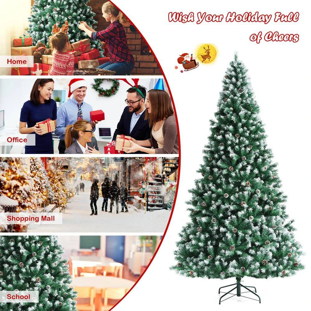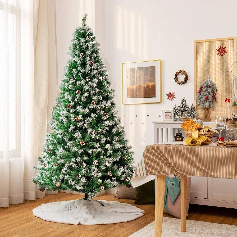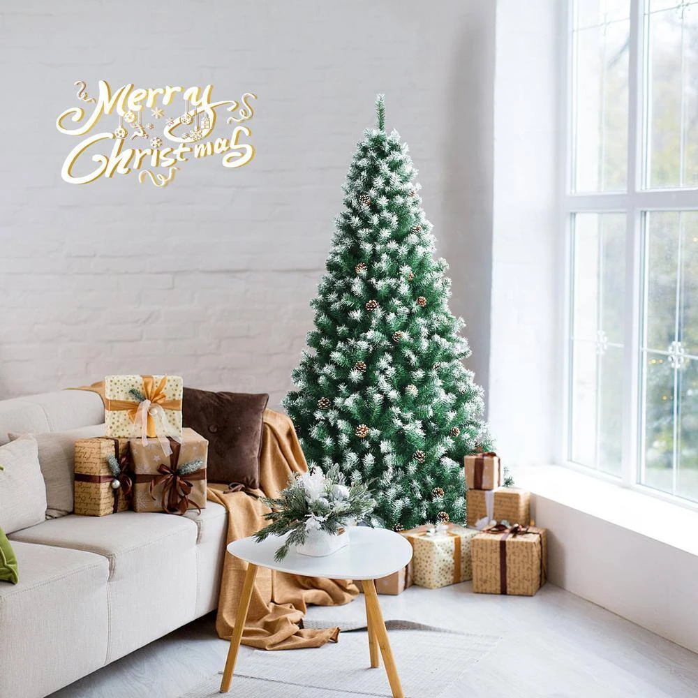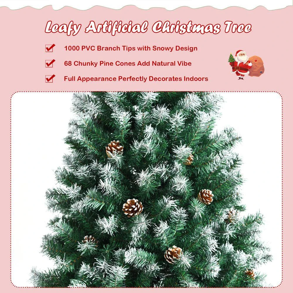 Get ready for the coming Christmas with this 6 ft. artificial Christmas tree. This full-shaped Xmas tree with pine cones hidden among leaves looks tall and gorgeous. And your holiday will be unusual with its natural charm and wintry appealthe1000 snowy branch tips create lush and leafy appearance, providing eye-catching and realistic look. Adopted with 100% new PVC, the tree fits family indoor use for a long time. Thanks to the hinged design, the branches will spread out automatically. So the tree is easy to assemble together by inserting 3 sections orderly and connecting the metal stand. Then you can put the installed tree in your home, office and mall, spreading festival joy and luck.