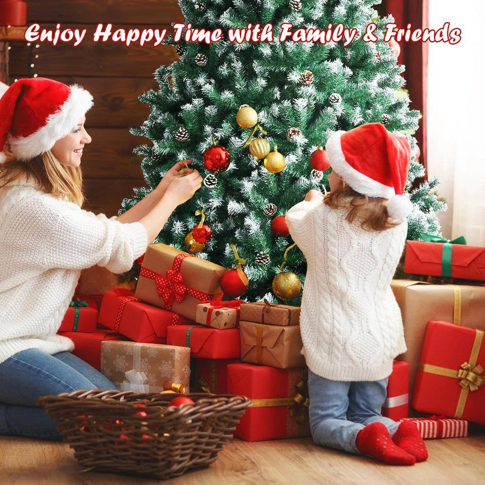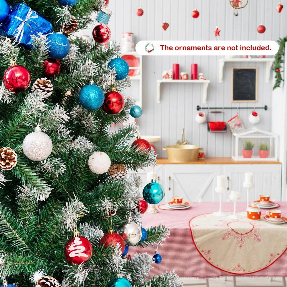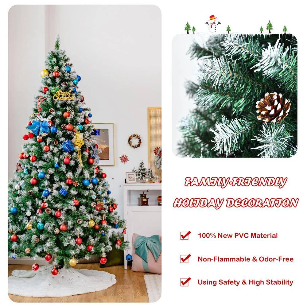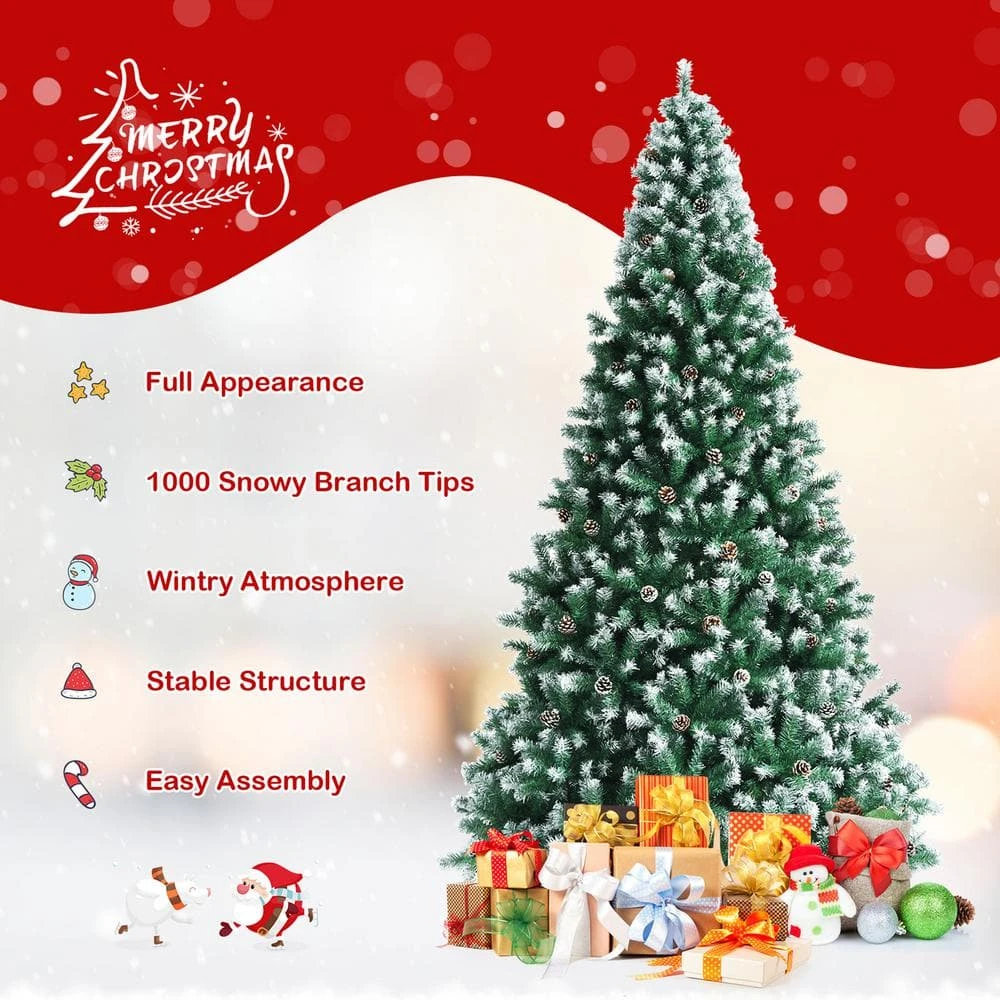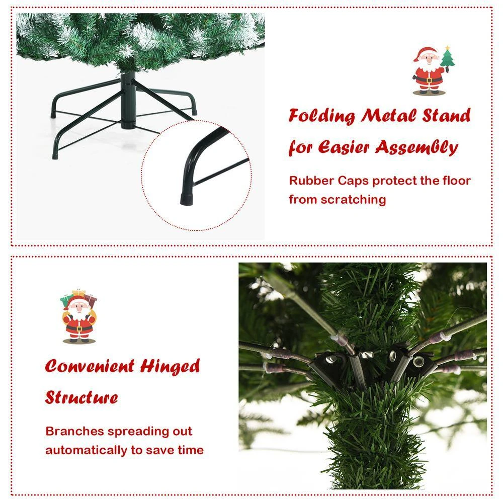 Get ready for the coming Christmas with this 6 ft. artificial Christmas tree. This full-shaped Xmas tree with pine cones hidden among leaves looks tall and gorgeous. And your holiday will be unusual with its natural charm and wintry appealthe1000 snowy branch tips create lush and leafy appearance, providing eye-catching and realistic look. Adopted with 100% new PVC, the tree fits family indoor use for a long time. Thanks to the hinged design, the branches will spread out automatically. So the tree is easy to assemble together by inserting 3 sections orderly and connecting the metal stand. Then you can put the installed tree in your home, office and mall, spreading festival joy and luck.