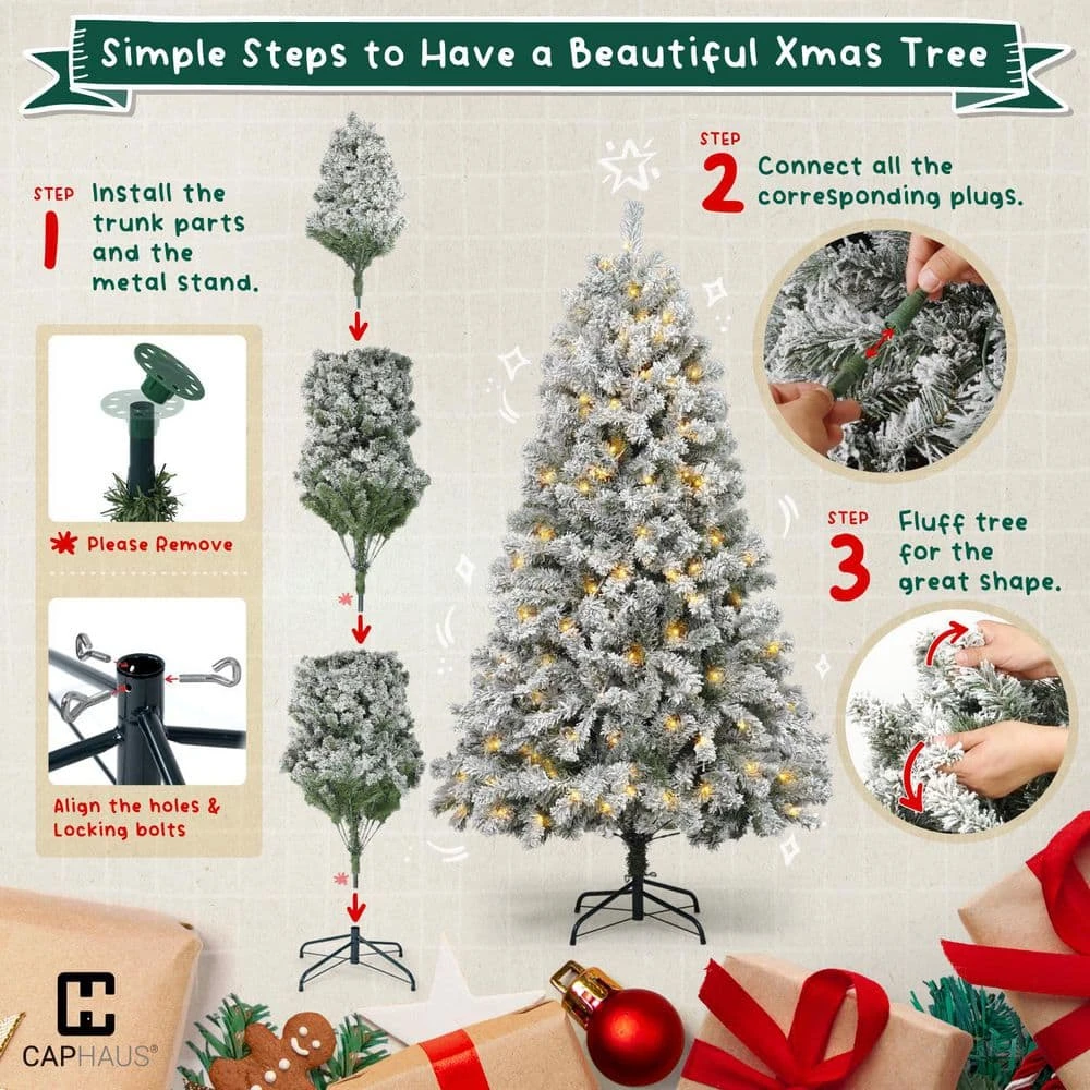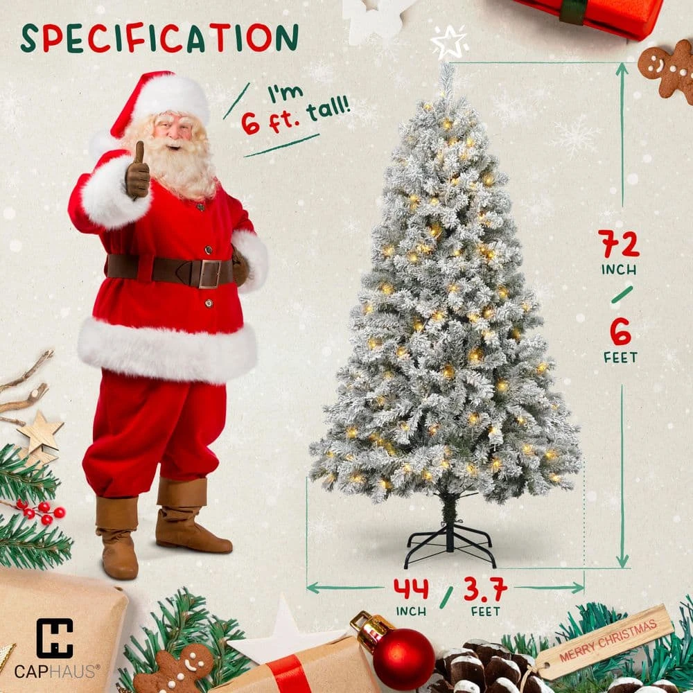 CAPHAUS 6 ft. Full Artificial Pre-Lit Snow Flocked Christmas Tree with 800 Branch Tips Pre-Hinged and Foldable Stand, 250 LED Lights, Fake Flocked Xmas Tree for Indoor, Office, Party, Holiday. Radiant Illumination: Elevate your celebrations with 250 built-in LED lights on our 6 ft. pre-lit snow-flocked Christmas tree. These energy-efficient lights cast a warm and inviting glow, enhancing the festive spirit, and making your tree a radiant centerpiece. Please note that this is an electronic product, it’s recommended to use indoors only.