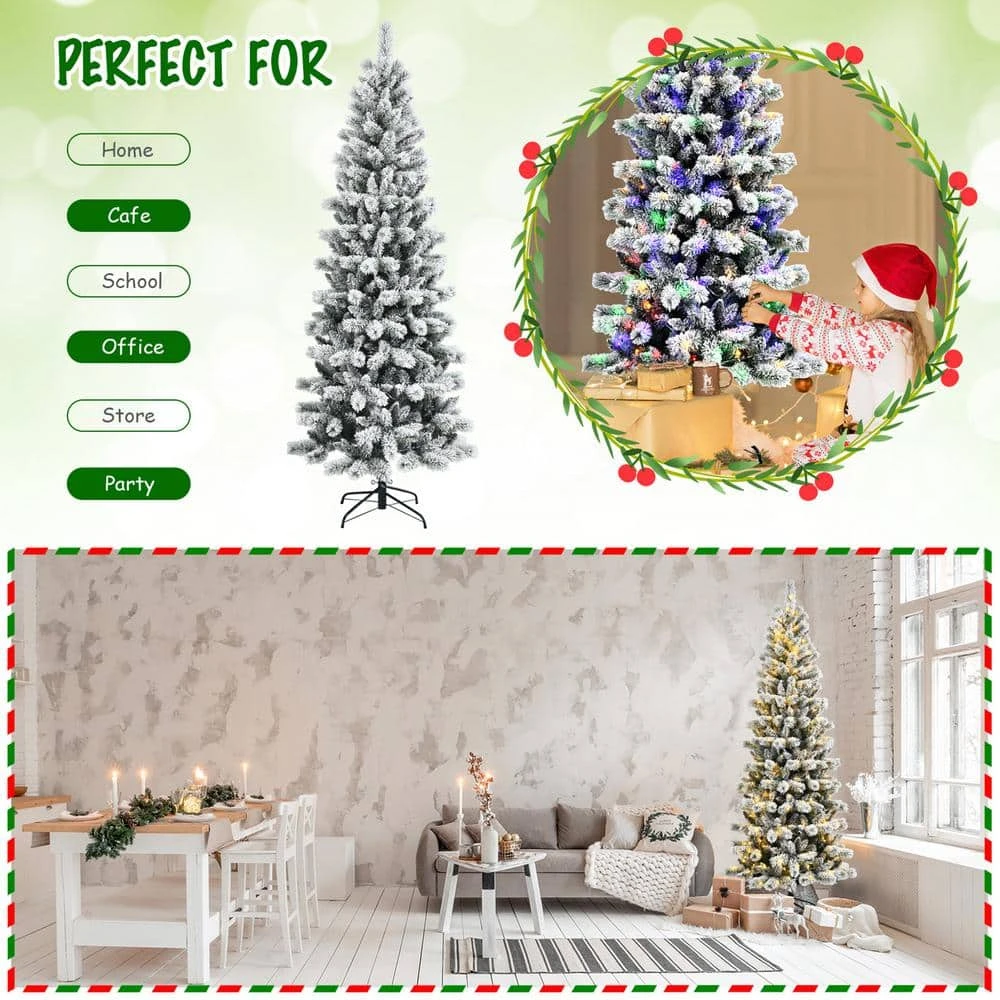 May you be happy and sweet in the coming holiday season. This snow flocked Christmas tree with 9 lighting modes emitted by 300 LED premium lights is used for improving the festive atmosphere and decorating your home with joy and cheer. When the night is coming, turn on the lights and set your preferred lighting modes through remote controller. With 693 individually crafted branch tips, the Christmas tree looks dense and full. Made of 100% new PVC, these branch tips are strong enough to bear extra ornaments as many as possible. The hinged design and foldable metal stand are convenient for disassembly and storage. Finally, it can bring you more warmth and happiness for your Christmas.