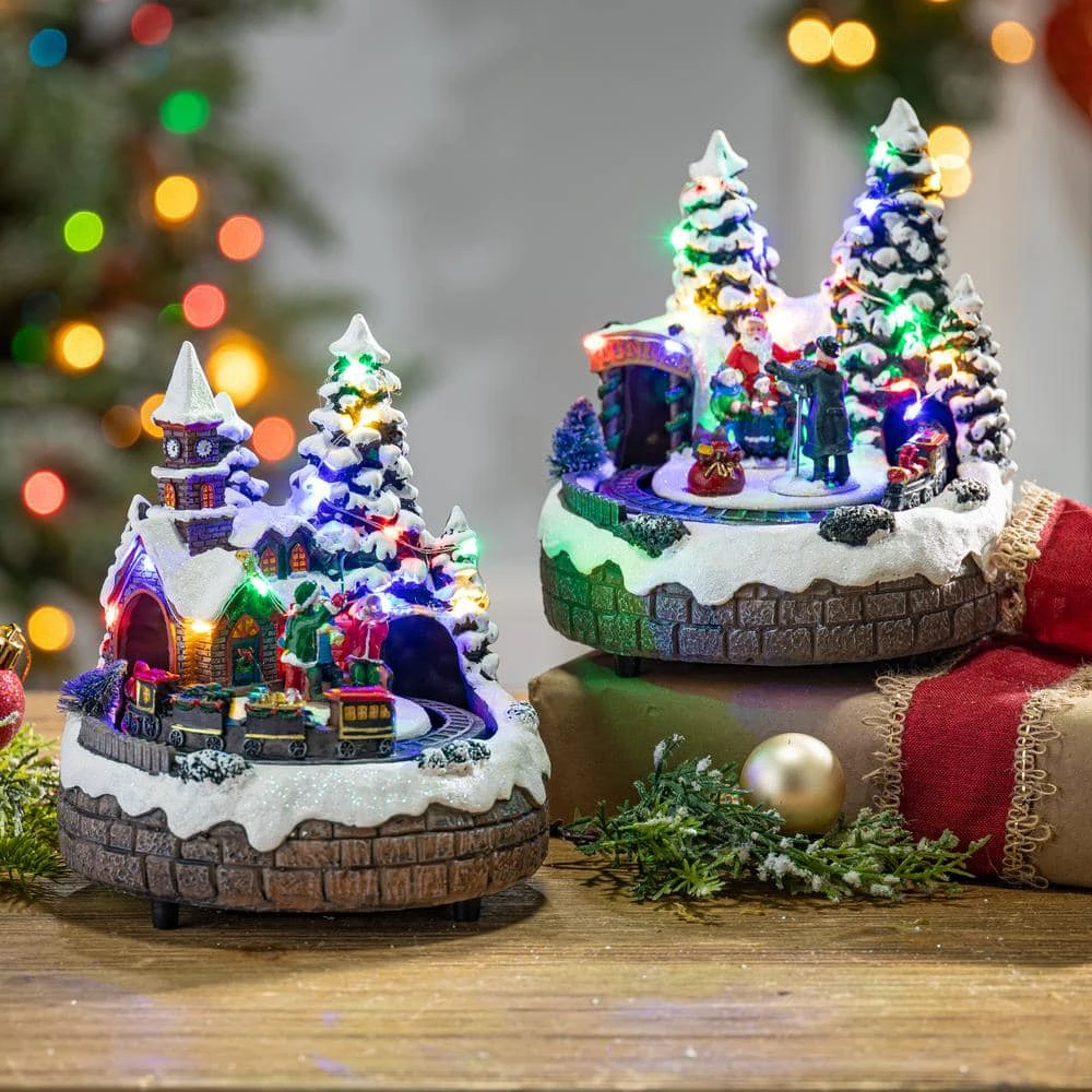These exquisitely detailed B/O 7.5 in. H lighted snow covered villages and trees are craft fully detailed. settings With moving trains and Christmas music will delight all who see them. Set of 2, 7.5 in. H B/O Lighted Musical Village with Moving Train with Timer (6-hours/18-hours.), 2 Styles. Each requires 3 AA batteries, not included, and UL approved adapter is included. Plays 8 different Christmas tunes.