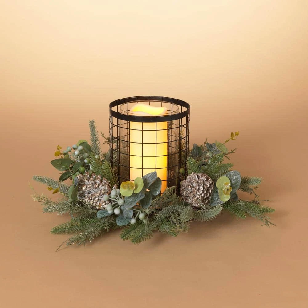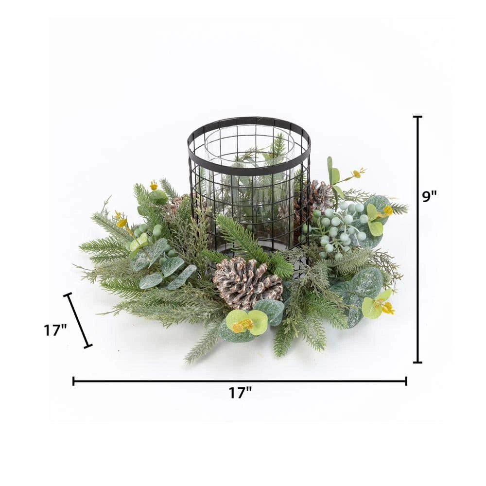 This 17 in. L holiday centerpiece is brimming with mixed winter faux flora and fauna. At the center is a metal paned glass candle holder that is beautifully accented by the surrounding greenery. Candle not included.