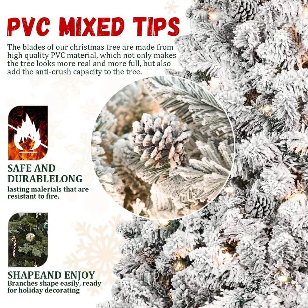 Illuminate your holiday with this enchanting Christmas tree. A spectacle of 850 UL lights casts a warm white glow, creating a safe and captivating ambiance. Delight in the sight of 2240 branch tips, meticulously flocked to mimic the allure of a real wintry tree. Crafted from a brilliant fusion of PE and PVC materials, this regal masterpiece endures fire, fading and allergies, radiating authenticity throughout the season. Effortlessly assembled with its hinged frame, the Xmas tree expands its branches automatically.