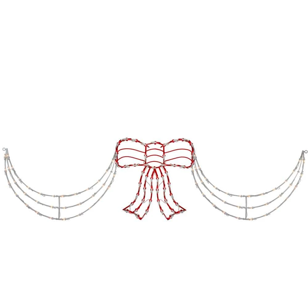 With the hustle and bustle of the Holiday you may not have enough time to fully decorate your home. This lighted swag will be a quick and easy option for adding some light to your outdoor space. Swag lights are perfect for hanging along your porch or outdoor fencing. Also could be used for a Memorial Day Fourth of July or everyday decoration. Features: 3-piece set includes 2 swags and 1 red bow. Color: clear bulbs on swags and red bulbs on bow/white wire. Each swag consists of 3 tiered light strings. Number of bulbs on swags: 105. Number of bulbs on bow: 50. Bulb size: mini-bulb. Spacing from the plug to the first light on swag: 4 in. Tail length: 4 in. Bow is separate and has its own 5.75 ft. white lead cord. Additional product features: UL listed for indoor/outdoor use. When 1 bulb burns out the rest stay lit feature. 120-Volt 60 Hz 0.2 Amp 24-Watt. End-to-end connectors allow you to connect multiple sets together (not to exceed 4 sets). Spare bulbs fuses and suction cup included. Durable lamp holders and plugs. Safety fuse plug. Dimensions:. Swag: 17 in. H x 26 in. W. Bow: 14 in. H x 14 in. W.