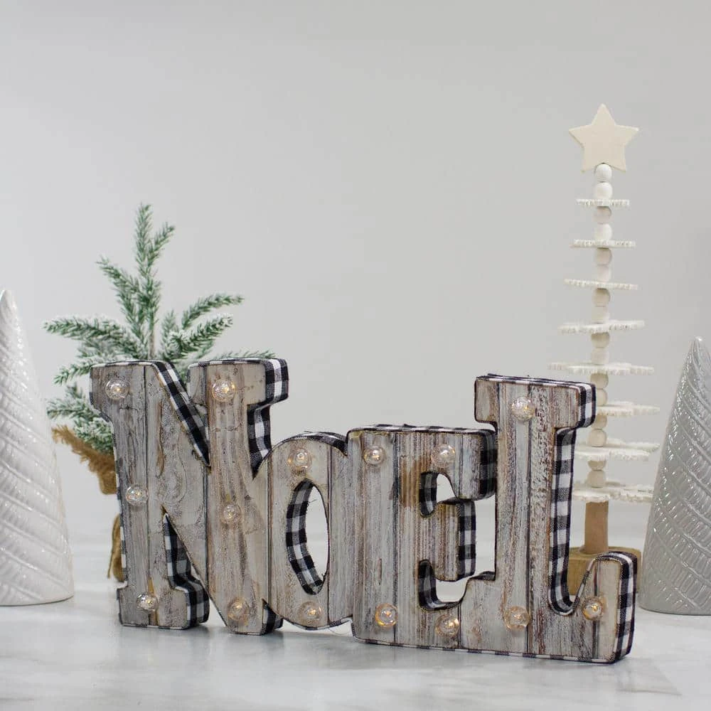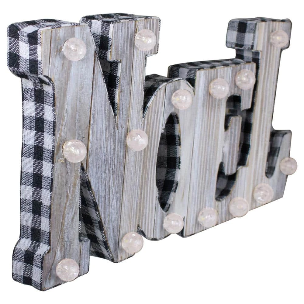 Bring a bit of the outdoors into your holiday decor with this sign. Features a wooden designed œNOEL in. light-up sign with 15 bright white bulbs surrounding the letters the best part is the words are 3D. All of these characteristics will impress your guests. You can place this sign on your mantel fireplace or even given away as a gift. Features: Christmas tabletop decor. Wooden design with the word œNOEL in. . Features 15 bulbs on the front of the sign. Battery Operated batteries not included. Recommended for indoor use only. Dimensions: 8 in. H x 17 in. W x 1.25 in. D. Materials: plastic/wood.