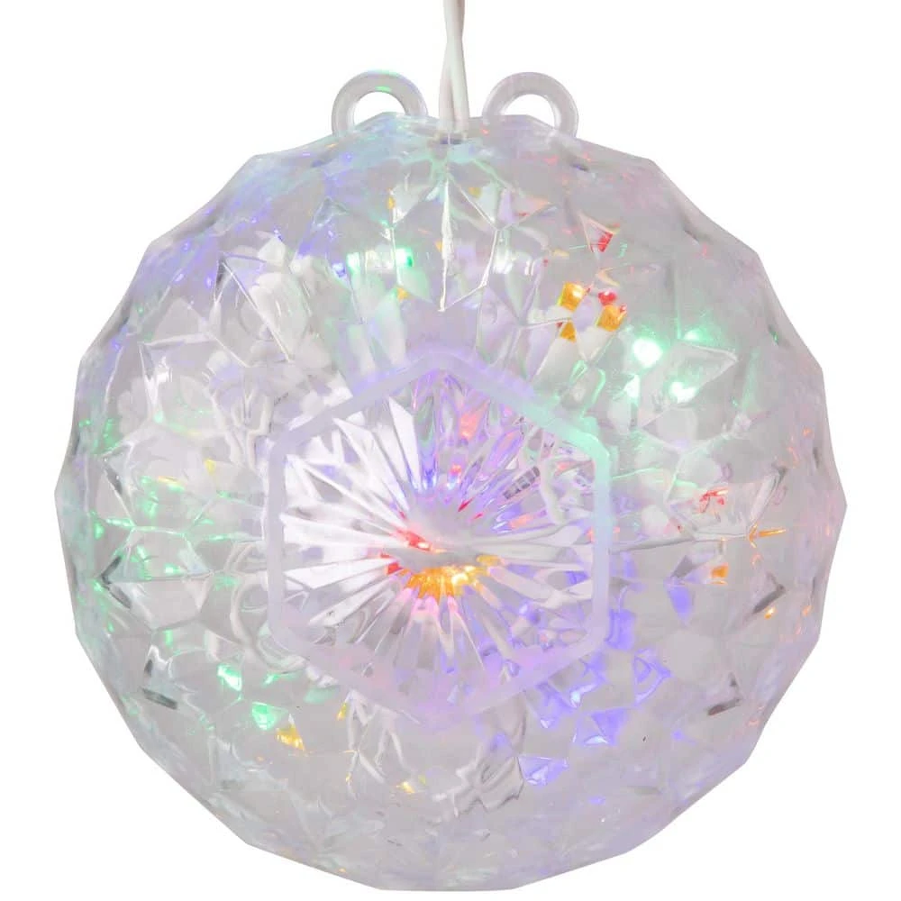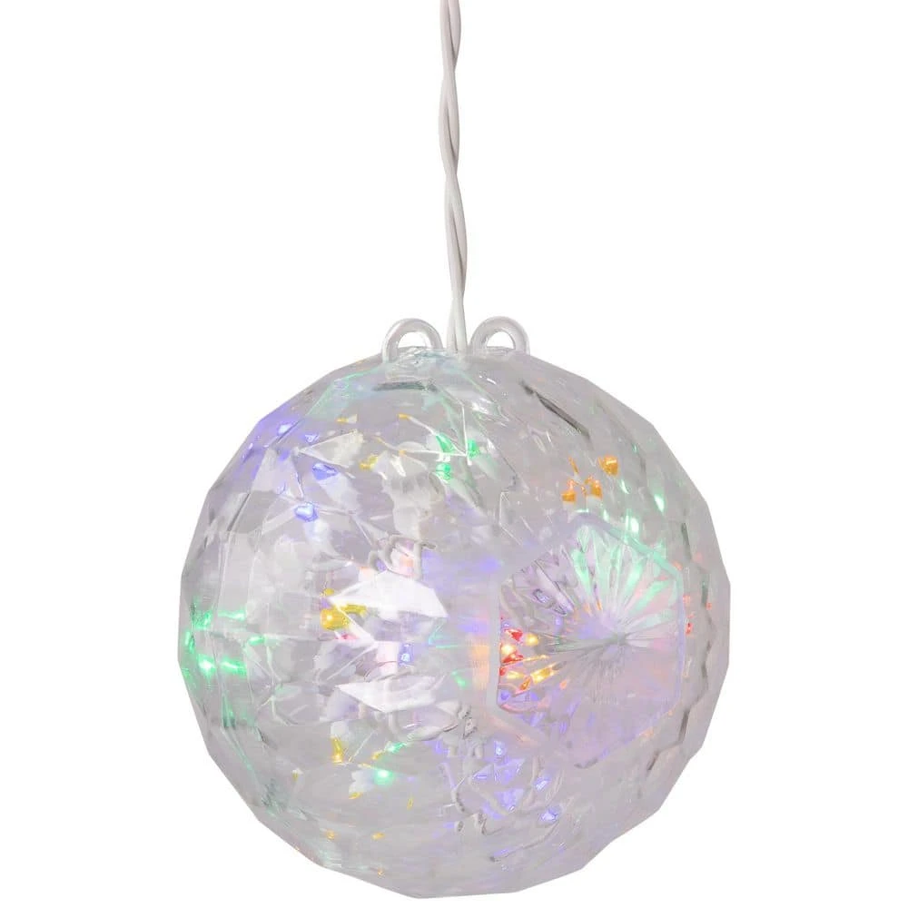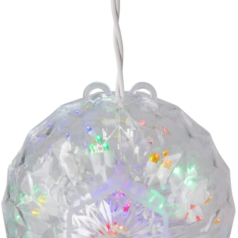 Light up the night with this awesome LED crystal sphere. Designed with wide angle LED lights the sphere is sure to add shine to your outdoor holiday decor. Great for Christmas the 4th of July Memorial Day and much more. Product Features: Number of bulbs inside sphere: 20-Bulb color: red green blue and yellow. Bulb size: wide angle. UL listed for indoor/outdoor use. 24 in. white lead cord. Rugged non-glass bulbs. Faceted design helps maintain stability for table top display as well as diffusing radiant light. Additional Product Features of LED Lights: Saves up to 90% energy. Ultra long-life. Generates minimal heat. Contains 1 plug with end connector allowing you to stack multiple lighted items together (not to exceed 210-Watt). Contains 2 spare bulbs and 1 replacement fuse. Sphere hangs from white electrical cord. 120-Volt 60 Hz 02 Amp 2.4-Watt. Dimensions: 6 in. Dia (150 mm). Material(s): plastic/wire.