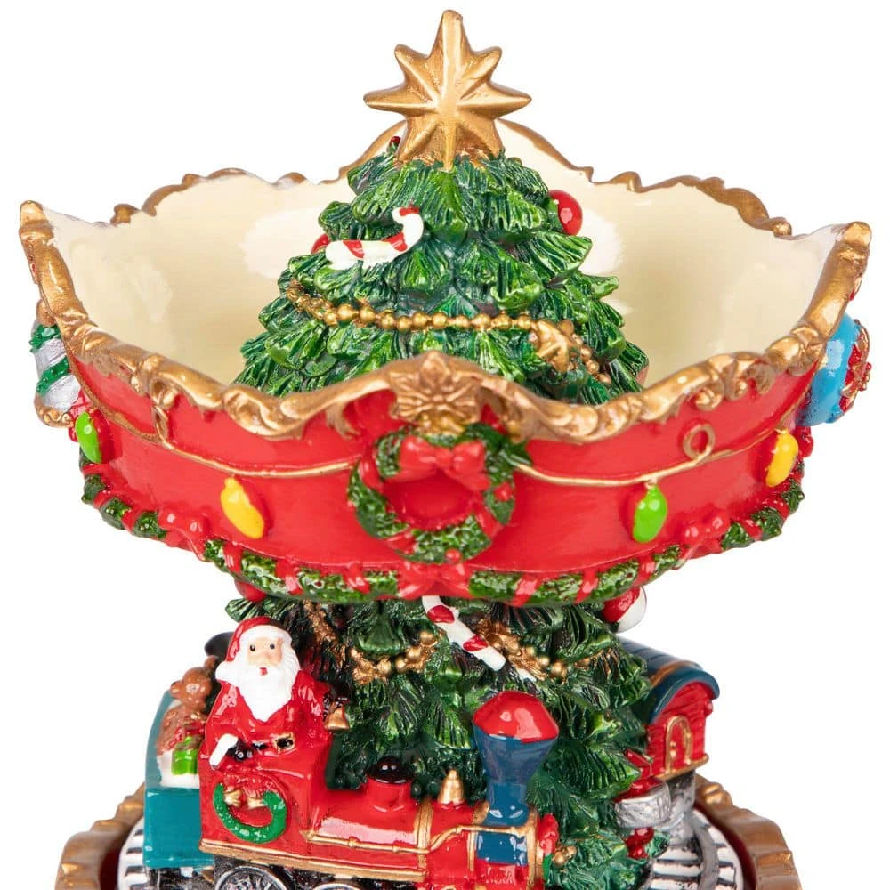 Add this festive carousel to your holiday decor this year This carousel features Santa on a red caboose with toys trailing behind him riding around in a circle on a track in the center is a Christmas tree. This music box is a perfect way to impress your guests this time around. You can place this carousel on your mantel end table or even as your table ft. s center-piece. Features: Christmas carousel tabletop decor. Carousel is red and gold with a wreaths garland lights and stars. Santa sits in a train cart that is rotating around the decorated Christmas tree. Wind up the tree and it plays ft. We wish you a Merry Christmas ft. . Recommended for indoor use only. Dimensions: 6.5 in. H X 4.5 in. diameter. Materials: resin.
