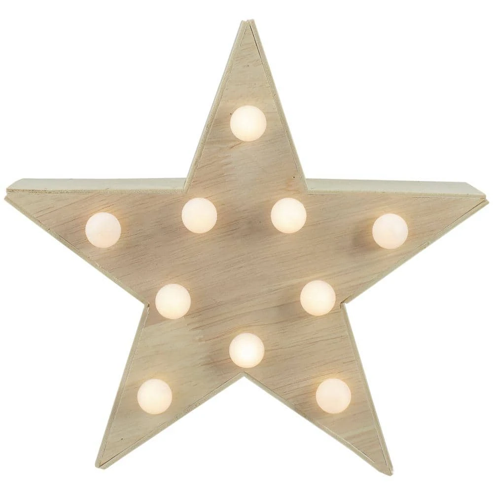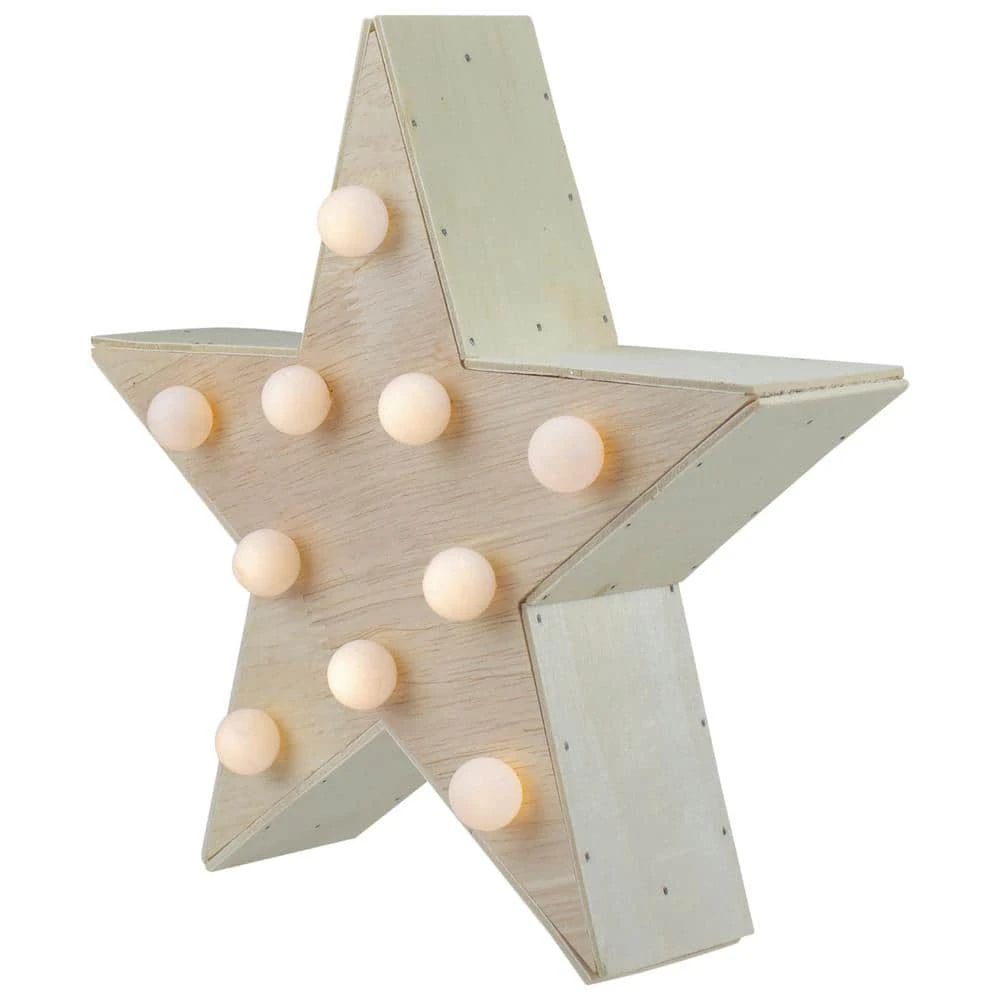 Bring a bit of the outdoors into your holiday decor. Features a wooden cutout light-up star with 10 bright white bulbs. The 3D characteristics will impress your guests. You can place this sign on your mantel fireplace or even give it away as a gift. Features: Christmas tabletop decor. 5 point cutout star. Wooden 3D design. Features 10 bulbs on the front. Requires 2 (AA) batteries; not included. Recommended for indoor use only. Dimensions: 9.25 in. H x 9.25 in. W x 2.25 in. D. Materials: plastic/wood.