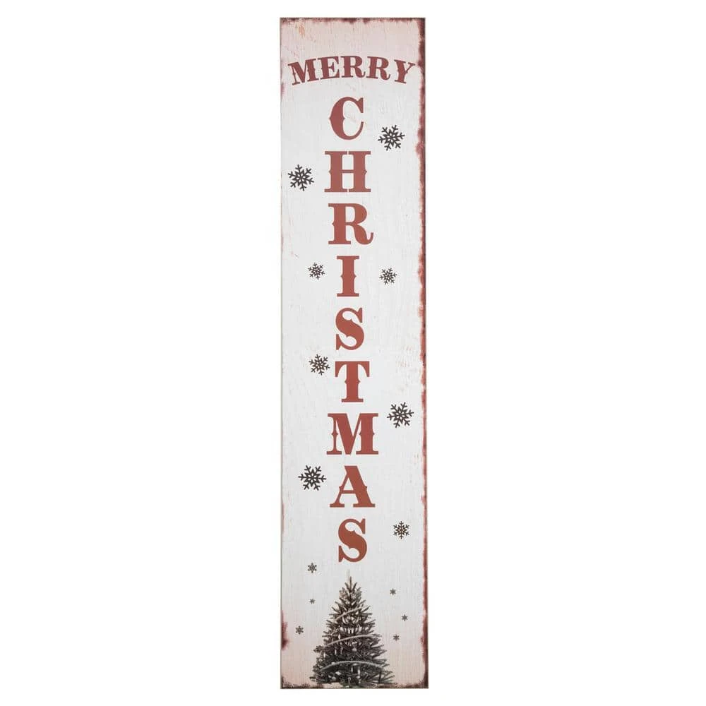 This sweet Merry Christmas porch leaner sign is the perfect touch to your country-rustic holiday decor. Its large size and weathered look make it the perfect addition to your decor season after season. Product Features: Merry Christmas tree and snowflake wall sign. Lightly distressed feature. Comes ready-to-hang or lean against a wall. Recommended for indoor use or outdoors under a covered area. Dimensions: 36 in. H x 7.75 in. W x .50 in. D. Material(s): wood.
