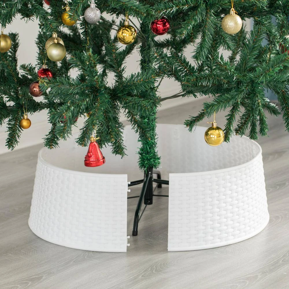 Tree skirt will cover your tree stand and add a finishing touch to your holiday tree. Assembles in minutes by clicking all pieces together, Durable plastic material features a basket weave pattern that’s washable and waterproof as well. Breaks down into 12 small pieces for easy storage.